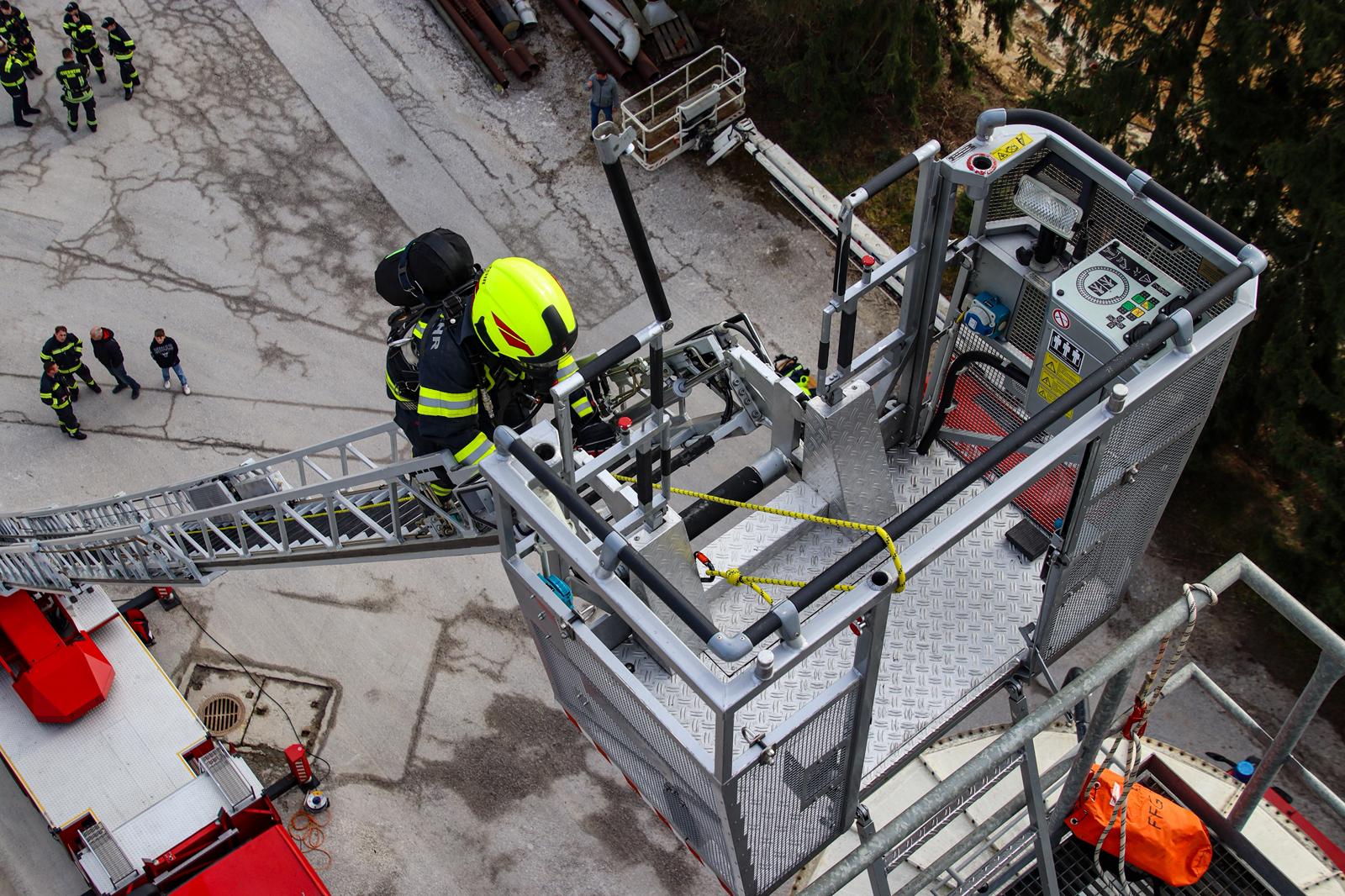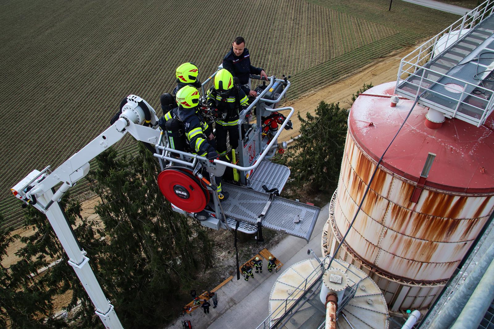 Im Anschluss erfolgte der Übungsgeil mit der TMB. Dabei bewegten wir uns weiter auf ein noch höheres Plateau. Dort erhielten wir eine Kurzeinschulung zum sicheren Umgang mit dem Korb der TMB in etwa 28 Metern Höhe. Danach folgte die Übung zur Rettung einer verletzten Person, die in den Korb der TMB verbracht wurde. Zusätzlich wurde das Umsteigen in den Korb unter Atemschutz sowie die Fremdversorgung mit Atemluft geübt.