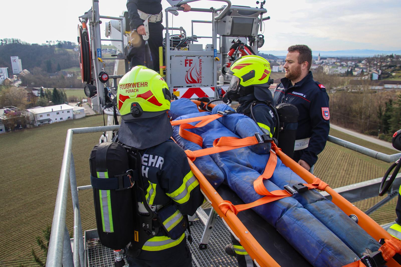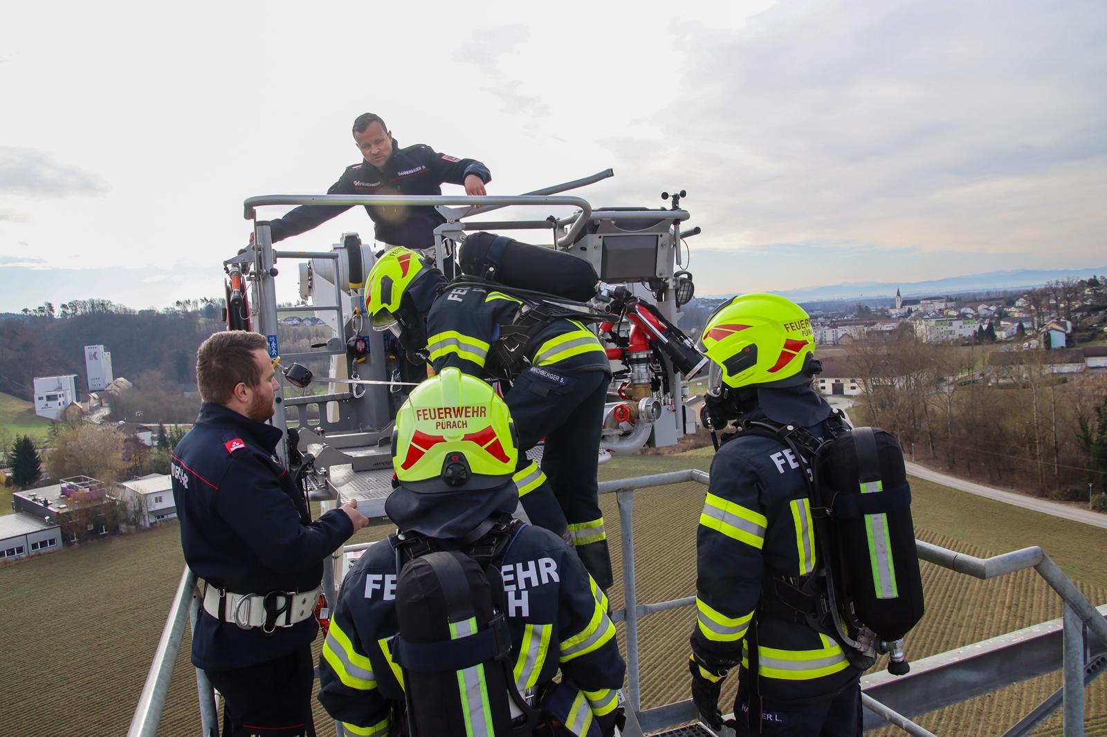 Diese realitätsnahen Szenarien stellen hohe Anforderungen an die Atemschutzträger:innen und sind für den Ernstfall von großer Bedeutung. Gerade Einsätze in großer Höhe oder bei schwierigen Zugängen erfordern eine perfekte Zusammenarbeit zwischen Atemschutztrupp und Bedienmannschaft der Hubrettungsgeräte.