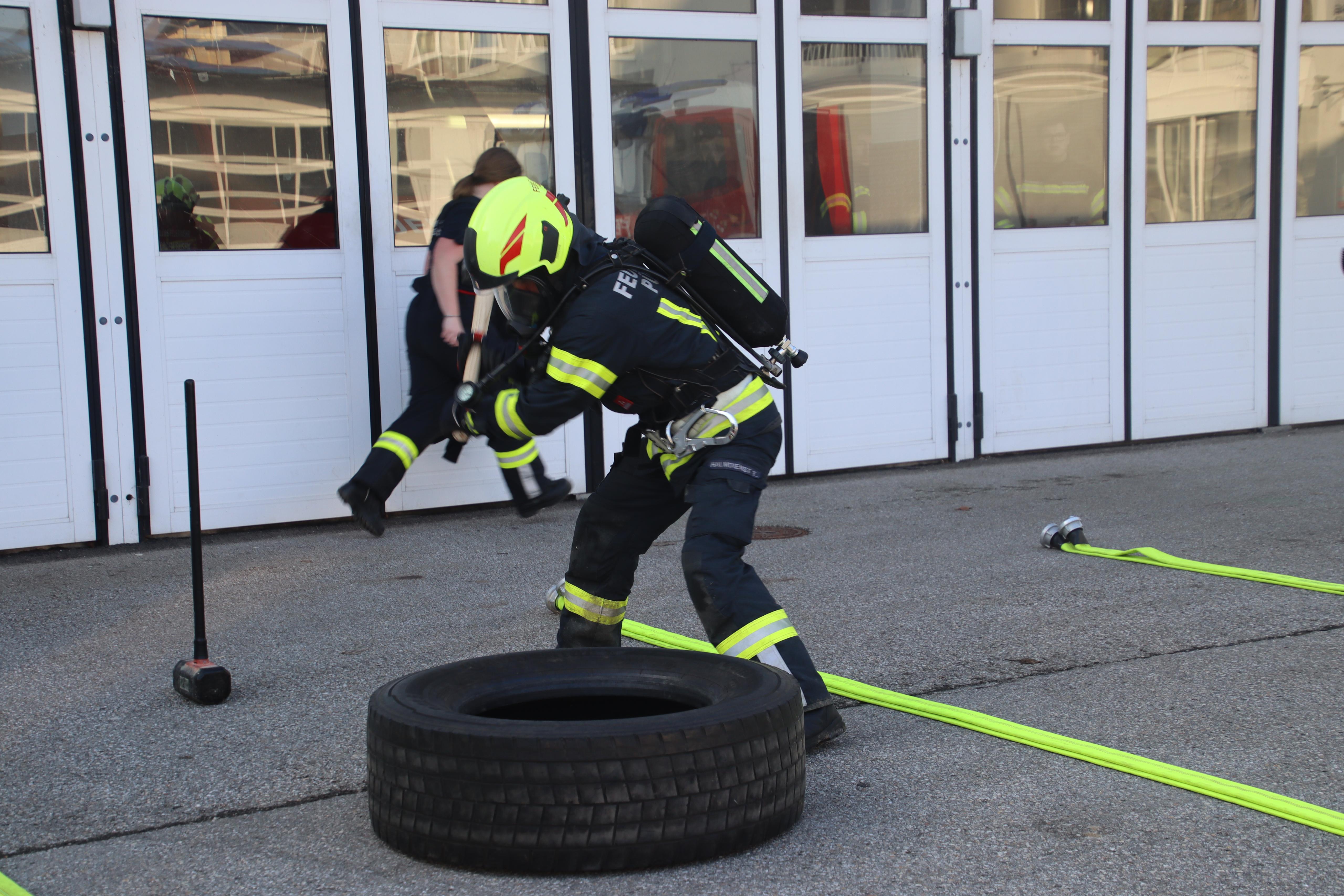 Nach dem Theorieteil ging es für unseren Atemschutztrupp in die Praxis. Dort waren bei mehreren Stationen Geschick, Teamarbeit und Genauigkeit gefragt – von der Personenrettung bis hin zu technischen Aufgaben und einem Leiteraufstieg.