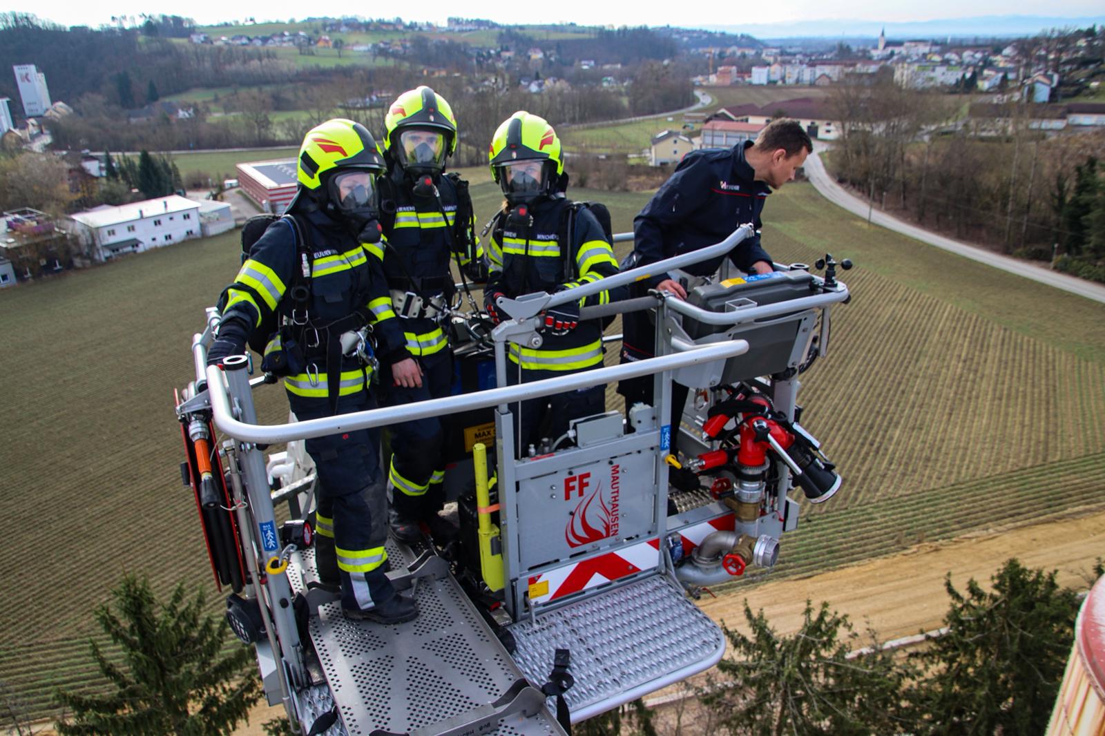 Diese realitätsnahen Szenarien stellen hohe Anforderungen an die Atemschutzträger:innen und sind für den Ernstfall von großer Bedeutung. Gerade Einsätze in großer Höhe oder bei schwierigen Zugängen erfordern eine perfekte Zusammenarbeit zwischen Atemschutztrupp und Bedienmannschaft der Hubrettungsgeräte.