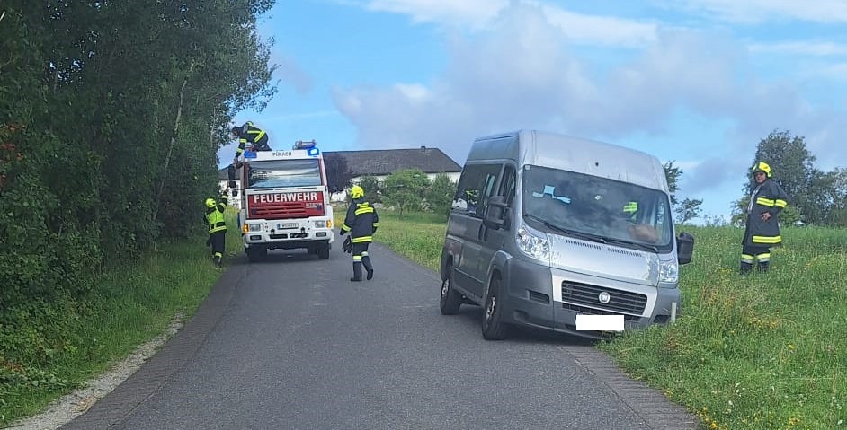 Ein Kleinransporter ist im Graben neben der Fahrbahn aufgesessen und musste wieder auf die Straße befördert werden.